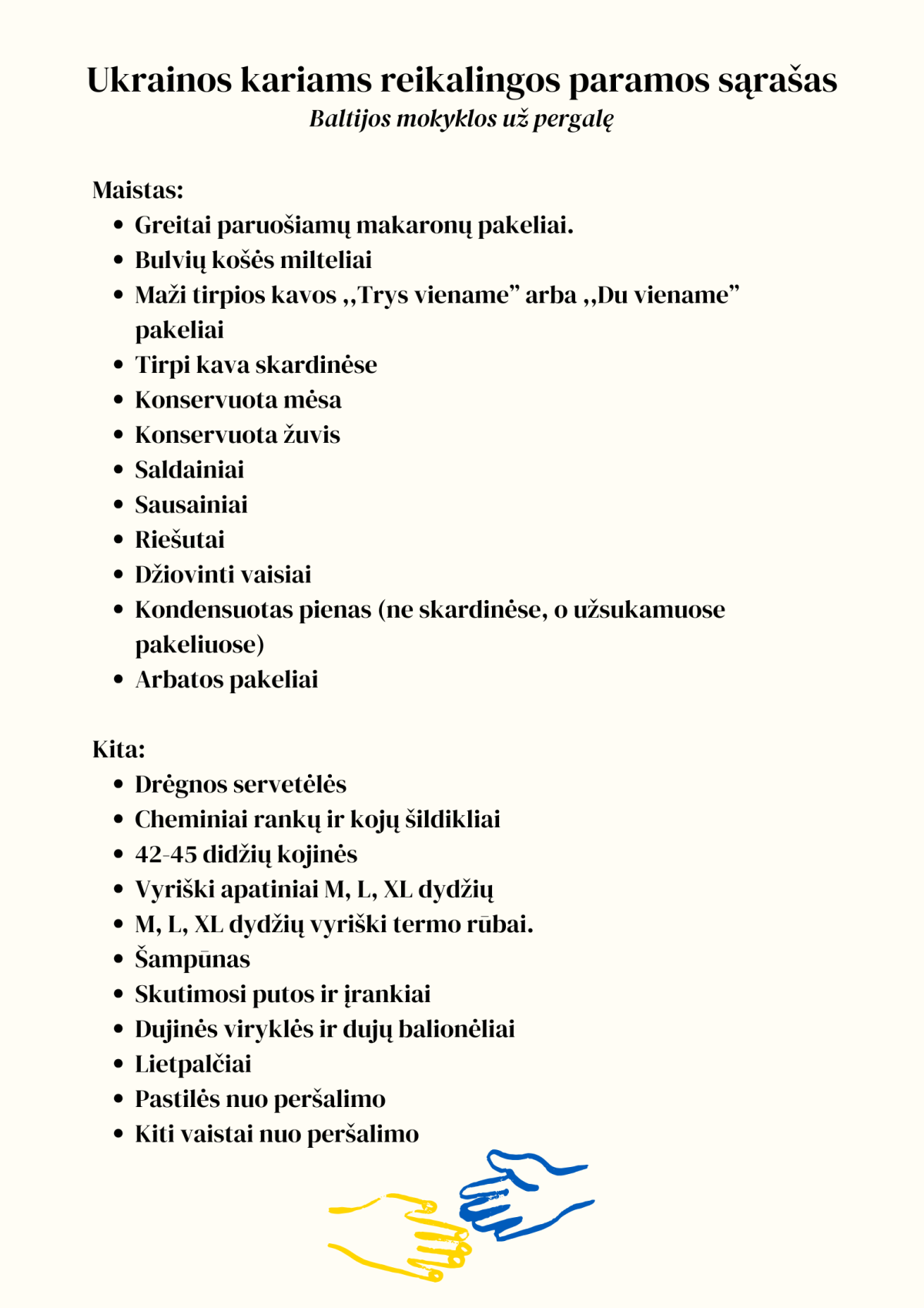 Sausio 20 d. – vasario 28 d. gimnazijos bendruomenė jungiasi dalyvauti tarptautinėje iniciatyvoje „Baltijos mokyklos už pergalę“. Tikime, kad ši akcija suburs visų Baltijos valstybių mokyklas į bendrą Ukrainai paremti skirtą judėjimą. Skelbiamas Ukrainos kariams reikalingos paramos sąrašas. Iki vasario 26 d. daiktus, priemones prašome nešti į soc. pedagogės I. Ambrozevičienės kabinetą (123 kab.)