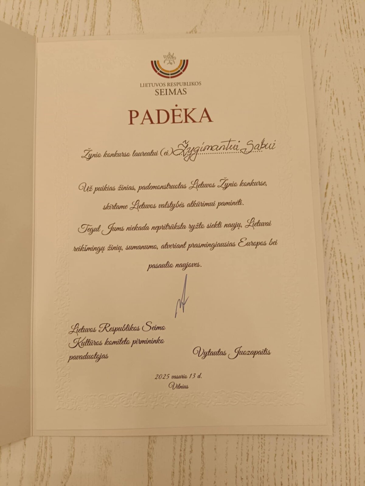 2025 m. vasario 13 d. Radviliškio Lizdeikos gimnazijoje vyko Lietuvos mokinių konkursas „Žynys“, skirtas Lietuvos Valstybės atkūrimo dienai paminėti. Konkurso dalyviai turėjo atsakyti į 100 klausimų iš įvairių visuomeninės veiklos, mokslo, technikos, meno, sporto sričių. Mūsų gimnazijai atstovavo Liepa Rūkštelytė, II s kl., ir Žygimantas Sabas, II a klasė. Labai džiugu, kad šio konkurso laureatu tapo Žygimantas Sabas. Sveikiname Žygimantą ir linkime pasiekti dar daug pergalių.