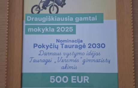 Džiaugiamės, kad „Versmės“ gimnazija buvo nominuota „Pokyčių Tauragė 2030“ kategorijoje ir apdovanota 500 eurų premija už projektą „Darnaus vystymo idėjos Tauragei „Versmės“ gimnazistų akimis“. Projekto vadovė – mokytoja ekspertė Jūratė Orlovienė.