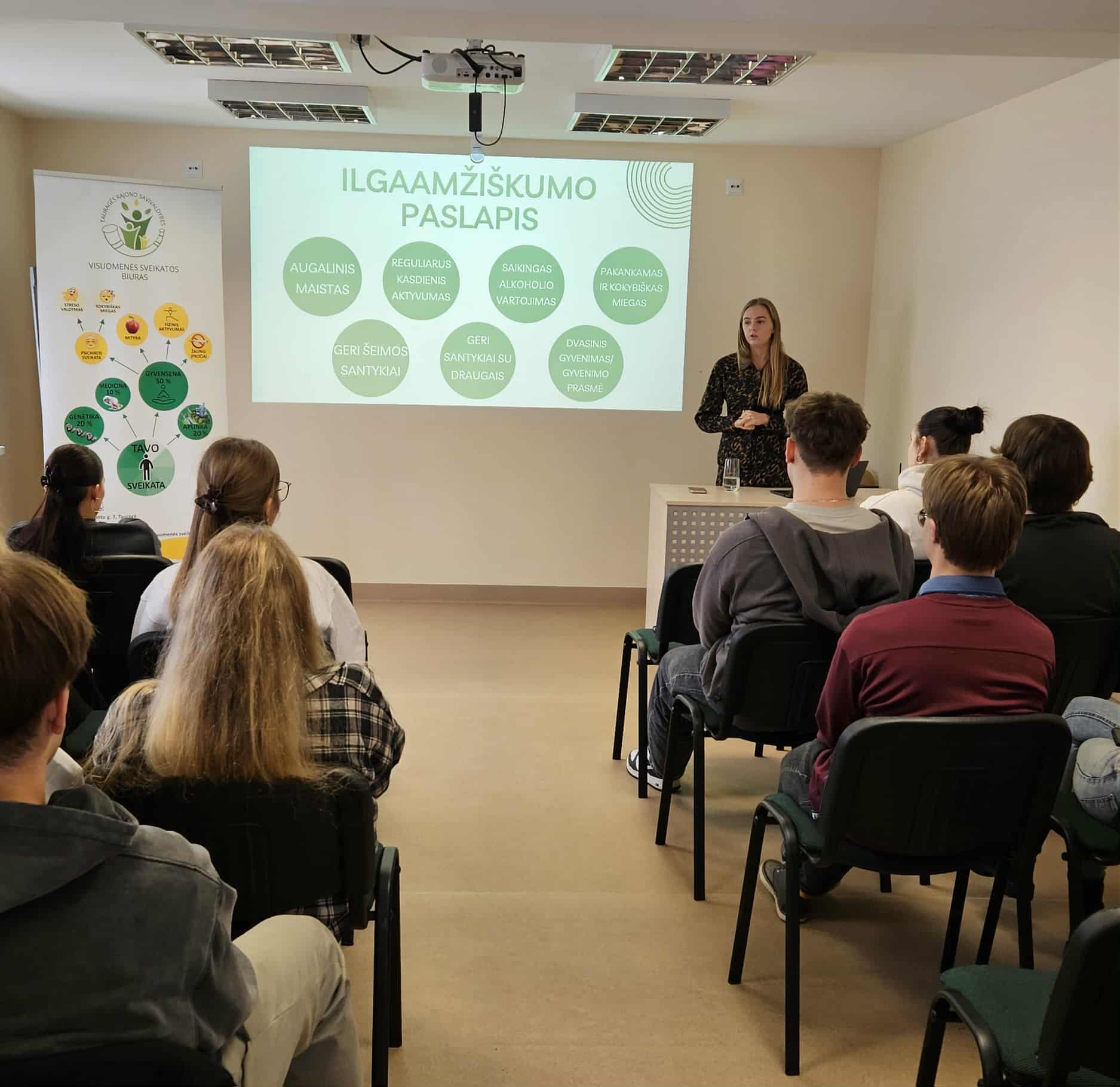 Lapkričio 17 dieną Tauragės ,,Versmės” gimnazijos IV a ir IV c klasės mokiniai dalyvavo dietologės Ievos Kulikauskienės paskaitoje ,,Sveikatai palanki gyvensena”. Paskaitos metu mokiniai plačiau sužinojo apie sveikos gyvensenos principus bei ilgaamžiškumo paslaptis. Dietologė taip pat pristatė penkias mėlynąsias zonas, papasakojo apie jose gyvenančių žmonių sveikesnį gyvenimo būdą, jų gebėjimą valdyti stresą bei veiksnius, kurie prisideda prie ilgesnės gyvenimo trukmės.