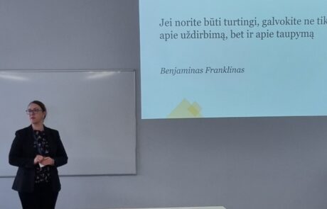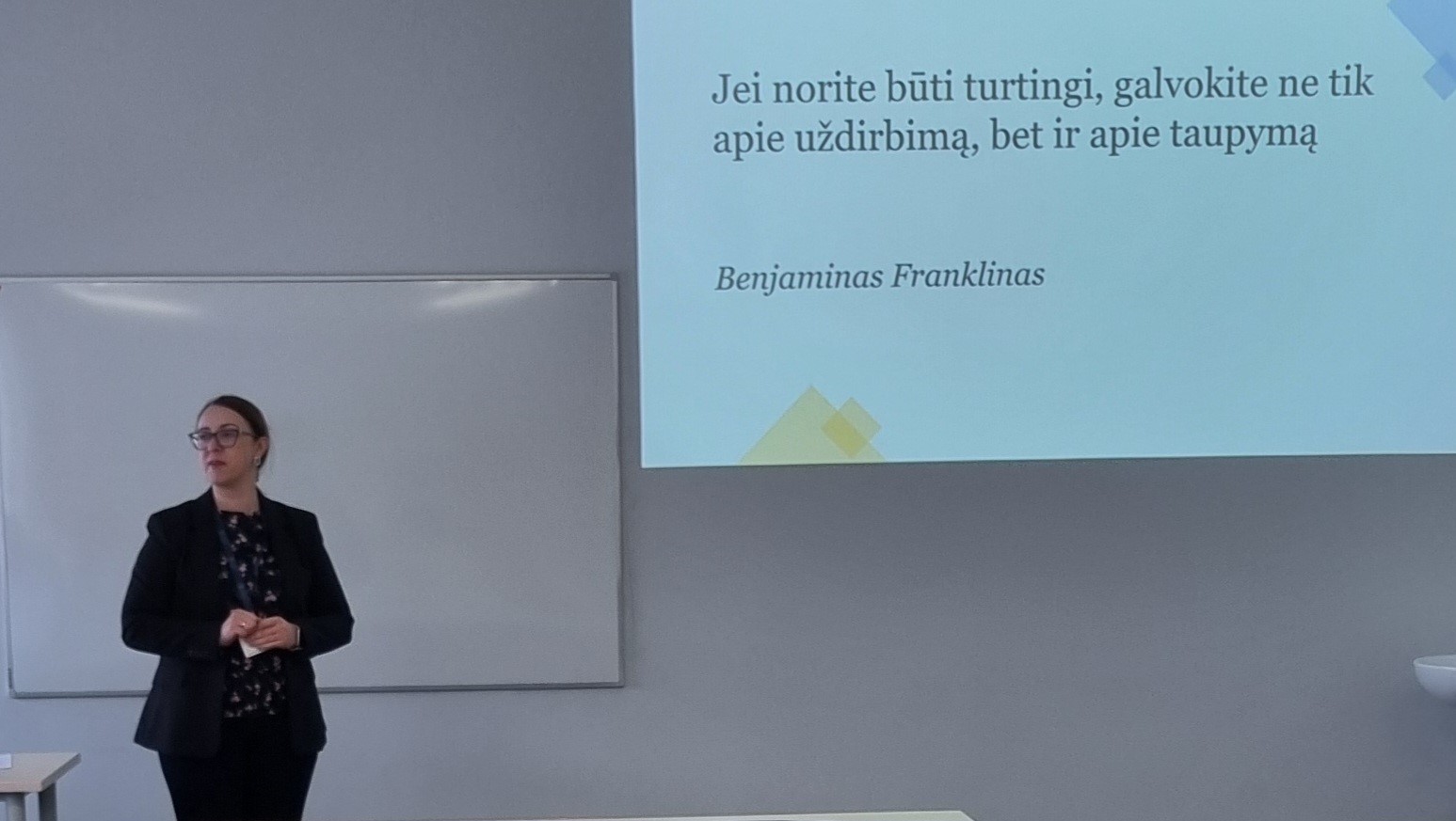 Finansinio raštingumo paskaitoje doc. dr. Erika Besusparienė supažindino mokinius su tema „Kaip nepaklysti šiuolaikinių finansų labirintuose?“. Gimnazistai nagrinėjo pinigų valdymo pagrindus, individualių finansų tvarkymo lygius, aiškinosi, kur dažniausiai išleidžiami pinigai. Paskaitos metu akcentuota, kodėl svarbu valdyti išlaidas, suprasti savo vertybes ir prioritetus, įsivertinti finansines galimybes bei priimti atsakingus sprendimus. Praktinių užduočių metu mokiniai mokėsi skirti poreikius nuo norų, analizavo gimtadienio vakarėlio biudžetą ir siekė suprasti, kaip užtikrinti finansinę pusiausvyrą bei ilgalaikį stabilumą. Kūrybinėje užduotyje gimnazistai įsivaizdavo save po 10–20 metų ir svarstė, kokie galėtų būti jų ateities pajamų šaltiniai.