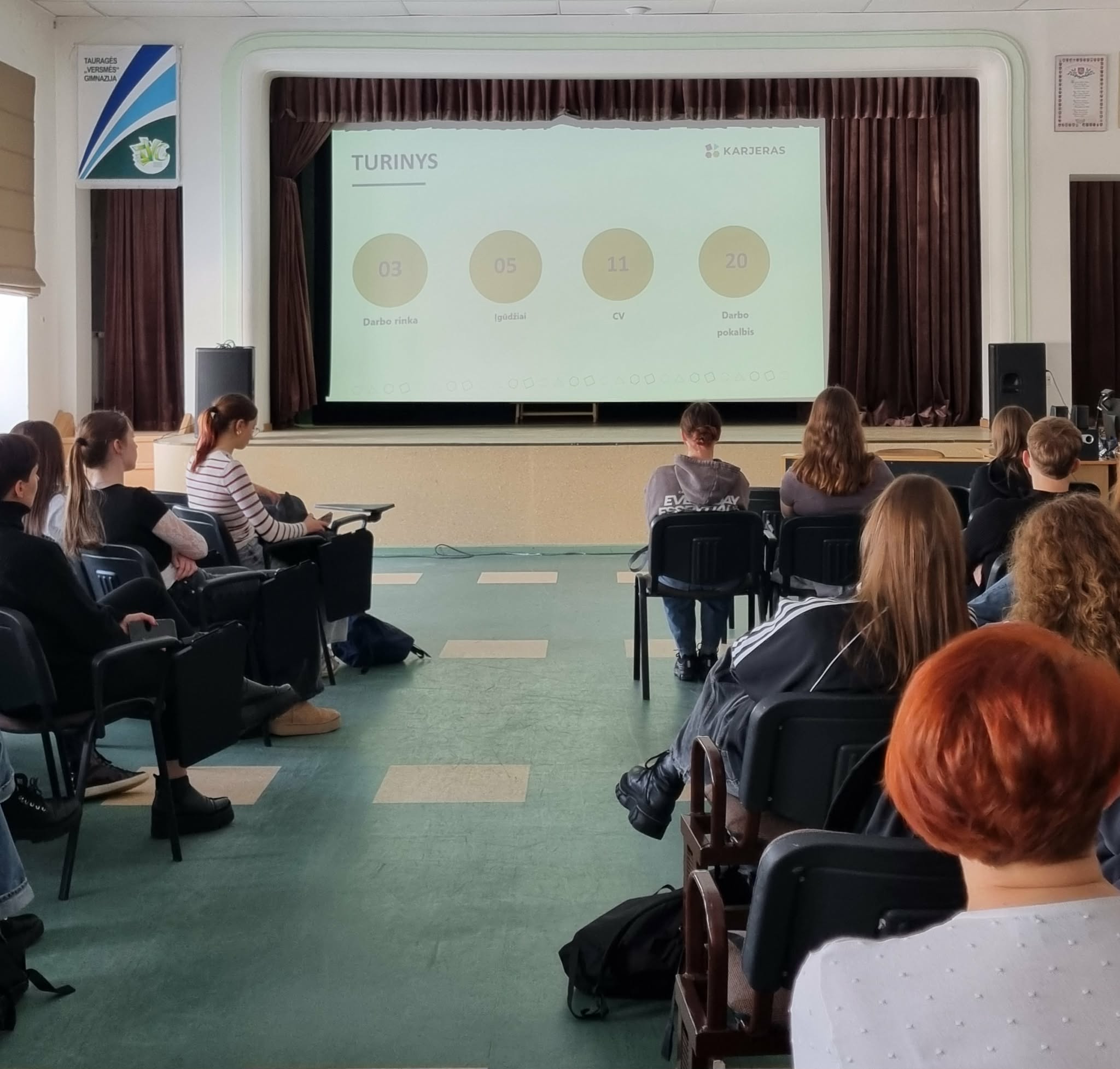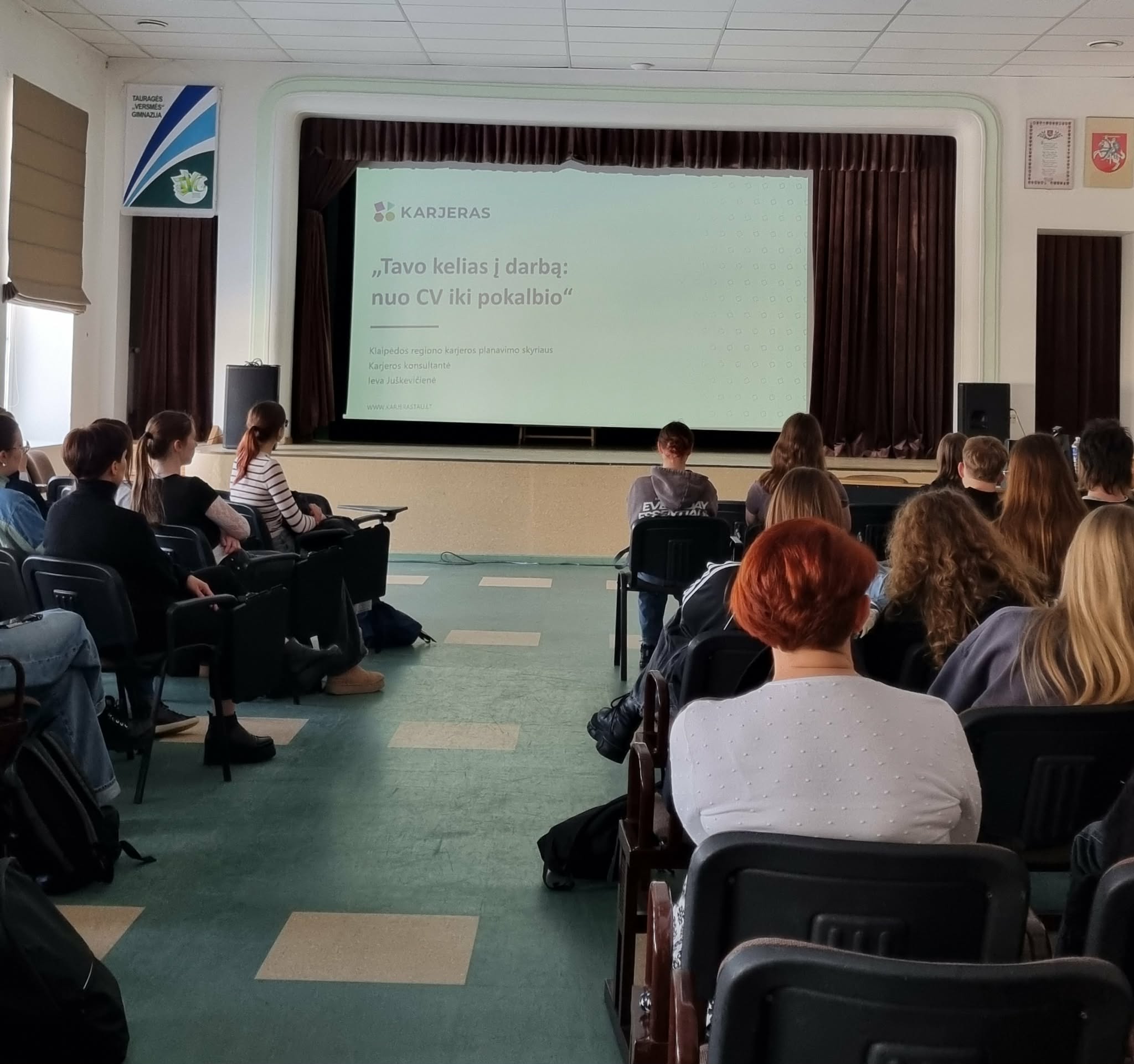 Vasario 25 d. II–III klasių mokiniams vyko integruota karjeros ugdymo pamoka „Tavo kelias į darbą: nuo CV iki pokalbio“, kurią vedė Klaipėdos regiono karjeros konsultantė Ieva Juškevičienė. Jos metu mokiniai turėjo galimybę iš arčiau susipažinti su šiuolaikine darbo rinka bei sužinoti, kokie pirmieji žingsniai padeda sėkmingai pradėti profesinį kelią.