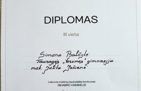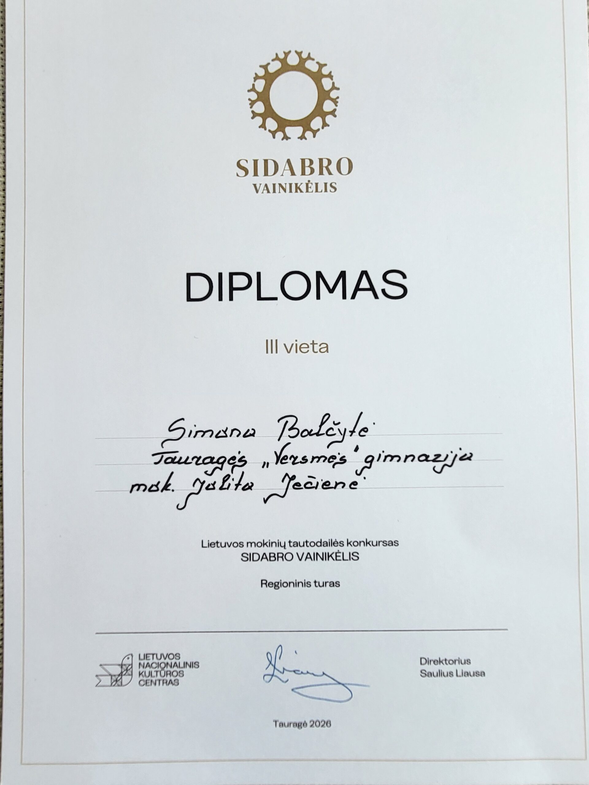 Kovo 31 d. Tauragės kultūros rūmuose vyko Lietuvos mokinių tautodailės konkurso „Sidabro vainikėlis“ Mažosios Lietuvos ir Pietų Žemaitijos regiono laureatų pagerbimo šventė. Joje mūsų gimnazijos III c klasės mokinė Simona Balčytė iškovojo garbingą III vietą.
